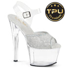 8" (200mm) Heel, 4" (100mm) Platform Ankle Strap Sandal w/ Rounded & Smooth Edges Featuring Clear Soft TPU Upper and Silver Rhinestone Fishnet Fabric Overlay. This Pleaser "TPU Premium" Style Comes with a Pair of Replaceable Matching Color Insoles and a Pair of Clear Platform Protectors.