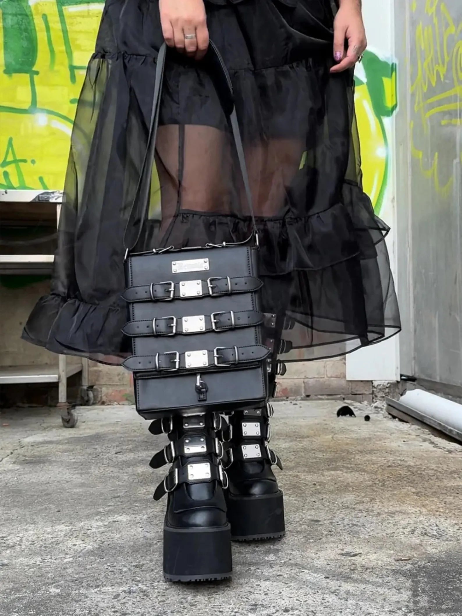 Meet Demonia's Triple Threat Crossbody Bag - this bag features three bold buckle straps across the front and a Demonia badge, making it the perfect accessory for your edgy and rebellious style. With plenty of room for all your essentials, this bag is a triple threat of functionality, style, and attitude!
