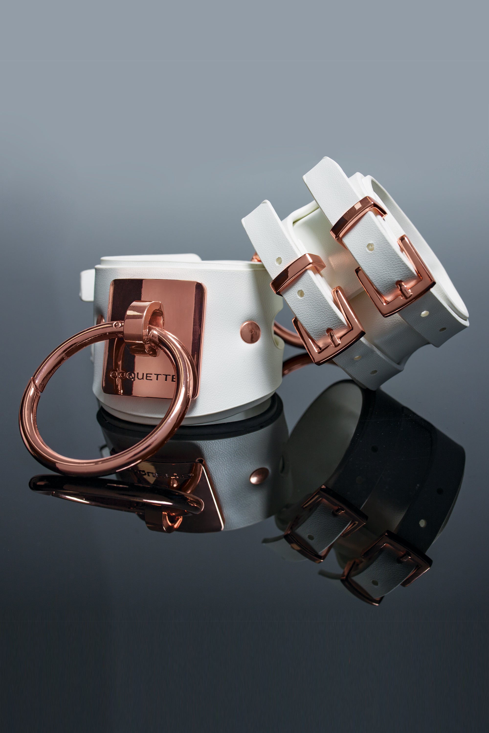 This metal-ring cuff features a large opening with adjustable buckle clasps to fit wrists between 5.9 - 8.25 inches (15 - 21 cm). Compatible with bondage lingerie and other accessories, this white and rose gold cuff is crafted from vegan leather and metal.