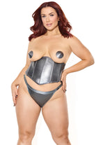 Enhance your waistline with our Gunmetal Glam Waist Cincher. The metallic pleather and removable metal chains create a unique, versatile style. The boned seams provide structure while the adjustable back straps allow for a perfect fit. Elevate any outfit with this chic and functional accessory.