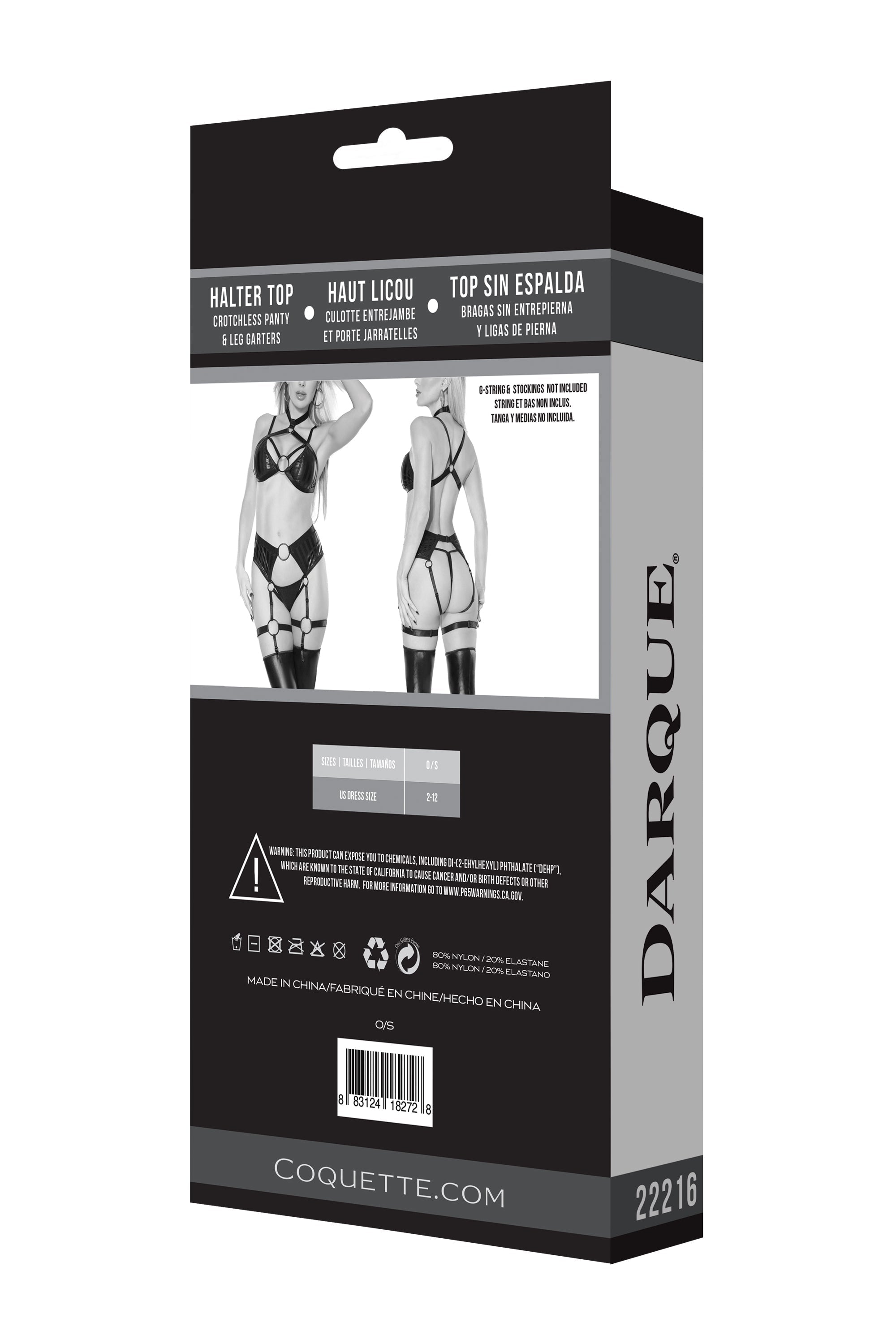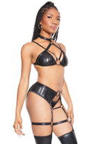 Striped Matte-Gloss Wet Look Set features a Halter Neck Bralette accented with a metal ring, plus adjustable strappy details.