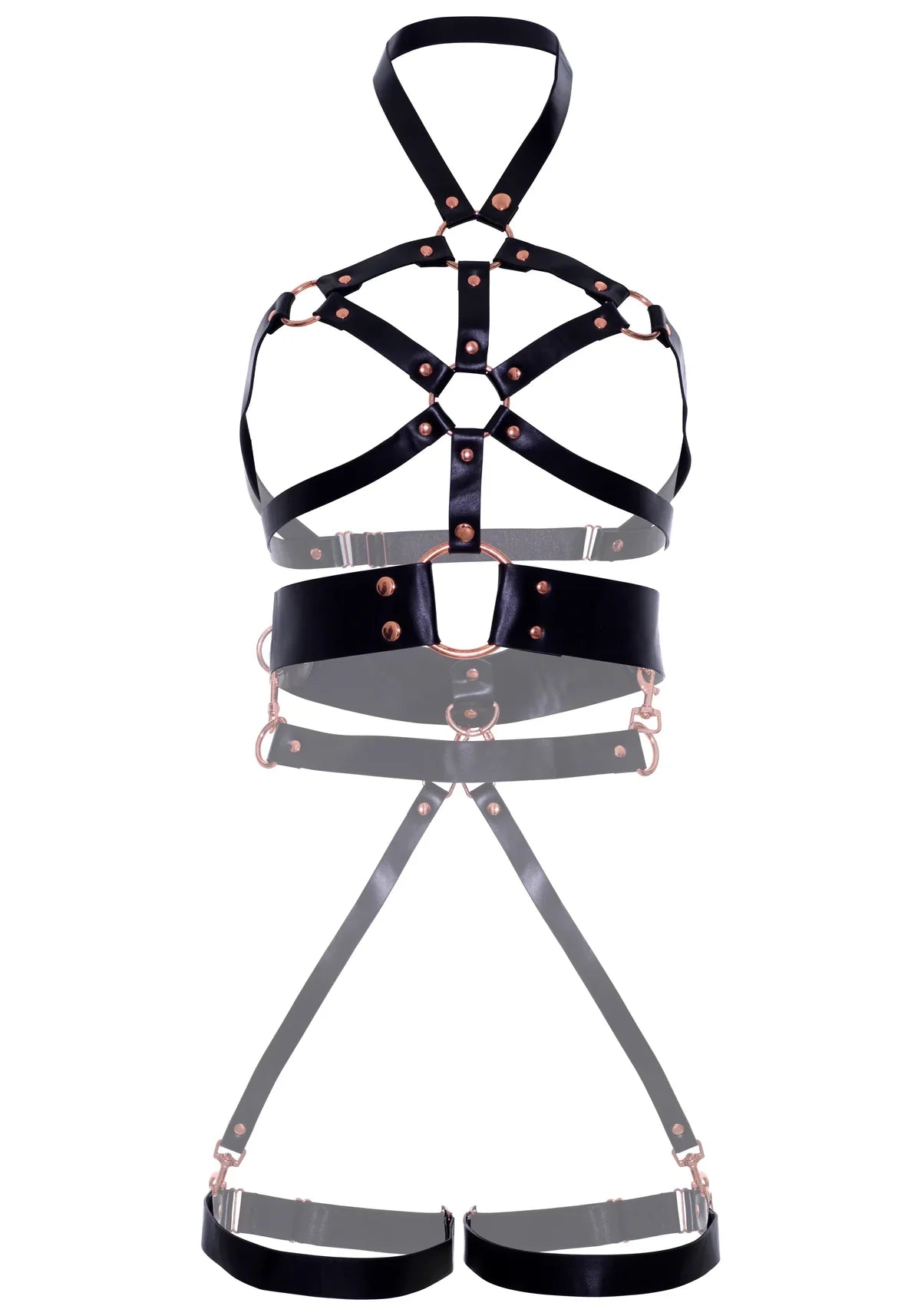 Let them take control in the ultra-naughty studded body harness by Leg Avenue. This hot lingerie look features a vegan leather O-ring studded body harness with detachable garters and a detachable back handle for ultimate control. Wear naked for ultimate effect or over a bodysuit for a daring night out look. Pair with panties and pasties, sold separately.