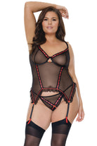 Underwire cups Ribbon through lace trim Mini rose details Ruffled mesh hem Adjustable back straps with hook closures Boned seams Adjustable straps and garters Adjustable G-string.