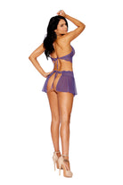 Elevate your intimate wardrobe with this daring scalloped lace halter neck bra set that commands attention. Featuring structured underwire cups for confident support and a bold strappy front detail, this bra delivers both style and substance. The adjustable halter neck and back tie closure offer a customizable fit that flatters your silhouette. Paired with a matching lace and mesh mini skirt adorned with an alluring back tie, this set creates an unforgettable look. The included mesh g-string completes the ensemble, giving you a coordinated set designed for those who aren't afraid to make a statement. Perfect for special occasions or whenever you want to feel absolutely irresistible.