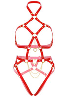 Fashion meets fetish with the ultra-sexy vegan leather studded harness lingerie teddy by Leg Avenue. Daring and versatile, this hot lingerie body harness features heart ring details and chain accents, adjustable straps, and a snap off panty. Pair over clothing as an edgy accessory or on its own for bedroom fun. Nipple pasties not included.