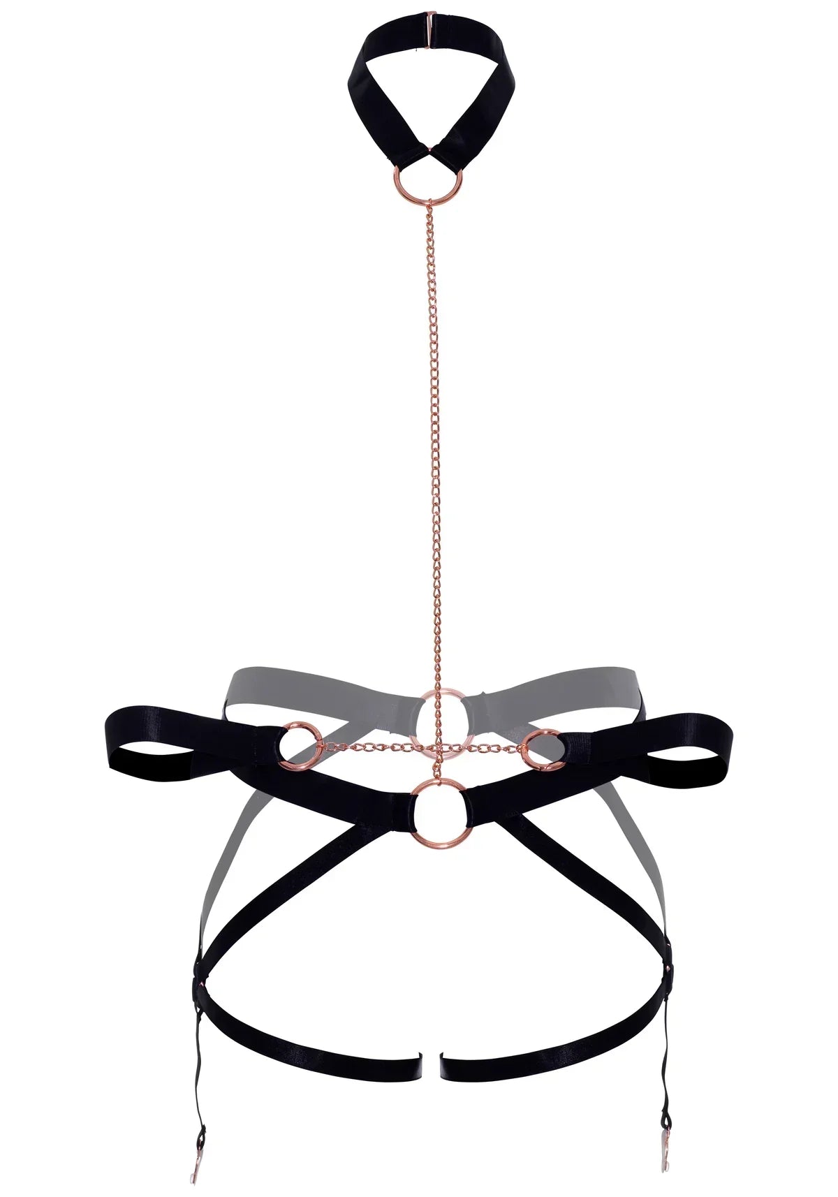 Indulge your pleasures in this ultra daring 2 PC chain choker body harness set by Leg Avenue. Featuring a satin elastic butt harness with side garters, rose gold hardware, and matching wrist restraints, this hot lingerie look is sure to impress.