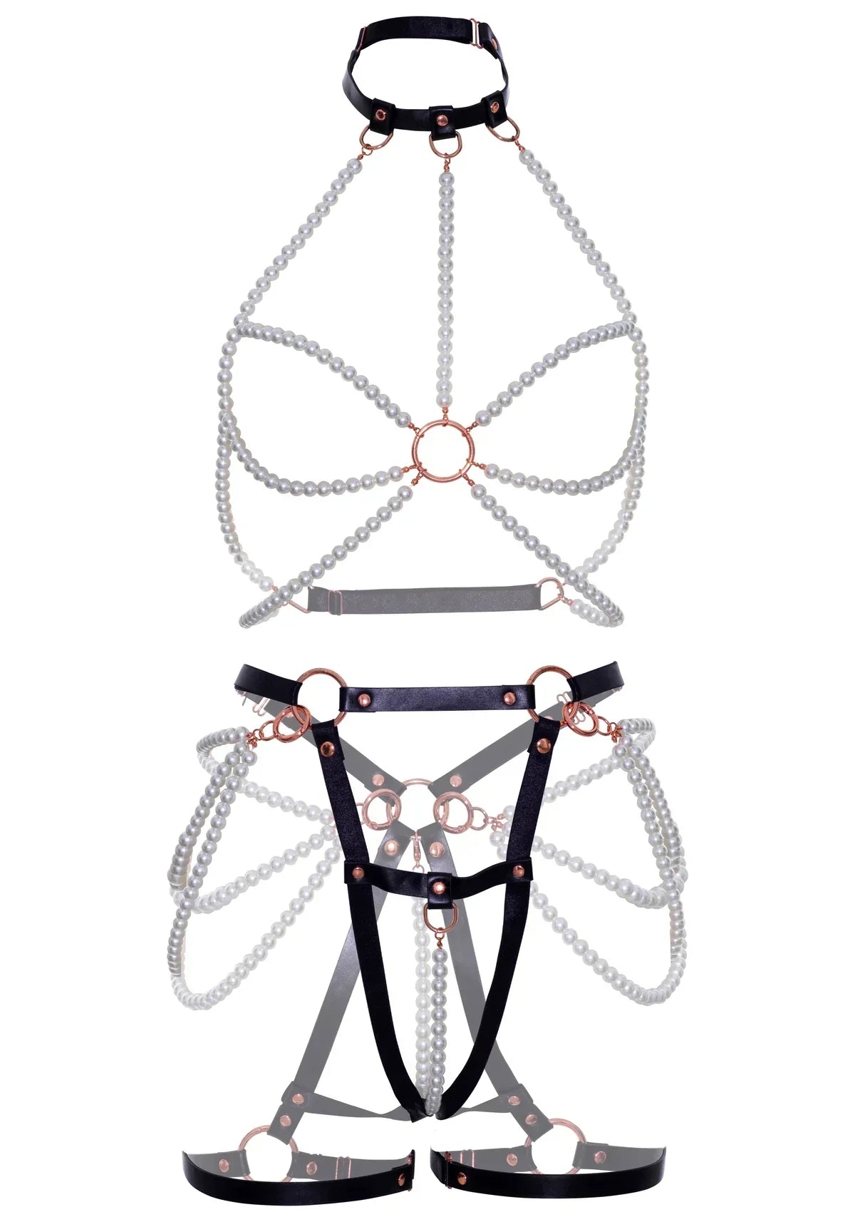 Spice up your nights with the stunning 2 piece pearl harness and panty lingerie set by Leg Avenue. This stunning look features a faux pearl multi strand halter harness top with O-ring detail and a convertible vegan leather butt harness with detachable panty and pearl strands. Wear this sexy lingerie naked for ultimate effect or layer over a lingerie. Panties shown sold separately.