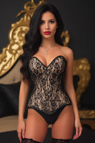 This daring black lace overbust corset features a sweetheart neckline that highlights your curves with a seductive silhouette. Its satin base and floral lace combine for a bold, elegant look, while acrylic boning shapes and supports without sacrificing comfort. The lace-up back ensures a perfect fit, making this corset a striking choice for evening wear, boudoir, or costume looks.