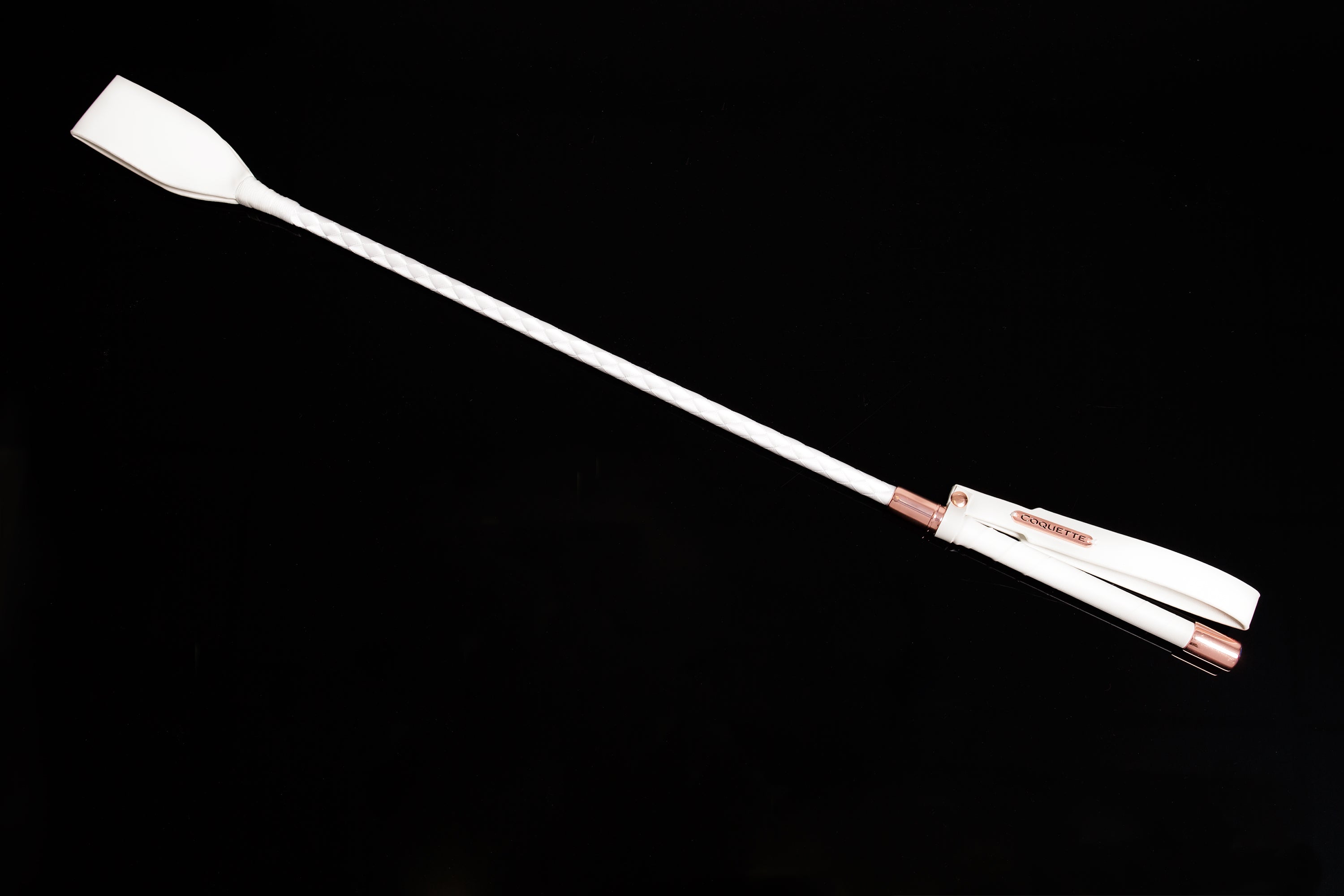 Crop features a matte finish diamond printed handle, a circumference of 11Ó (27.5cm), an overall length of 23.5Ó (59cm), a 3.75Ó (9.4cm) tip length, and a 1.5Ó (3.8cm) tip width. It is available in White/Rose Gold, and constructed of vegan leather and metal.