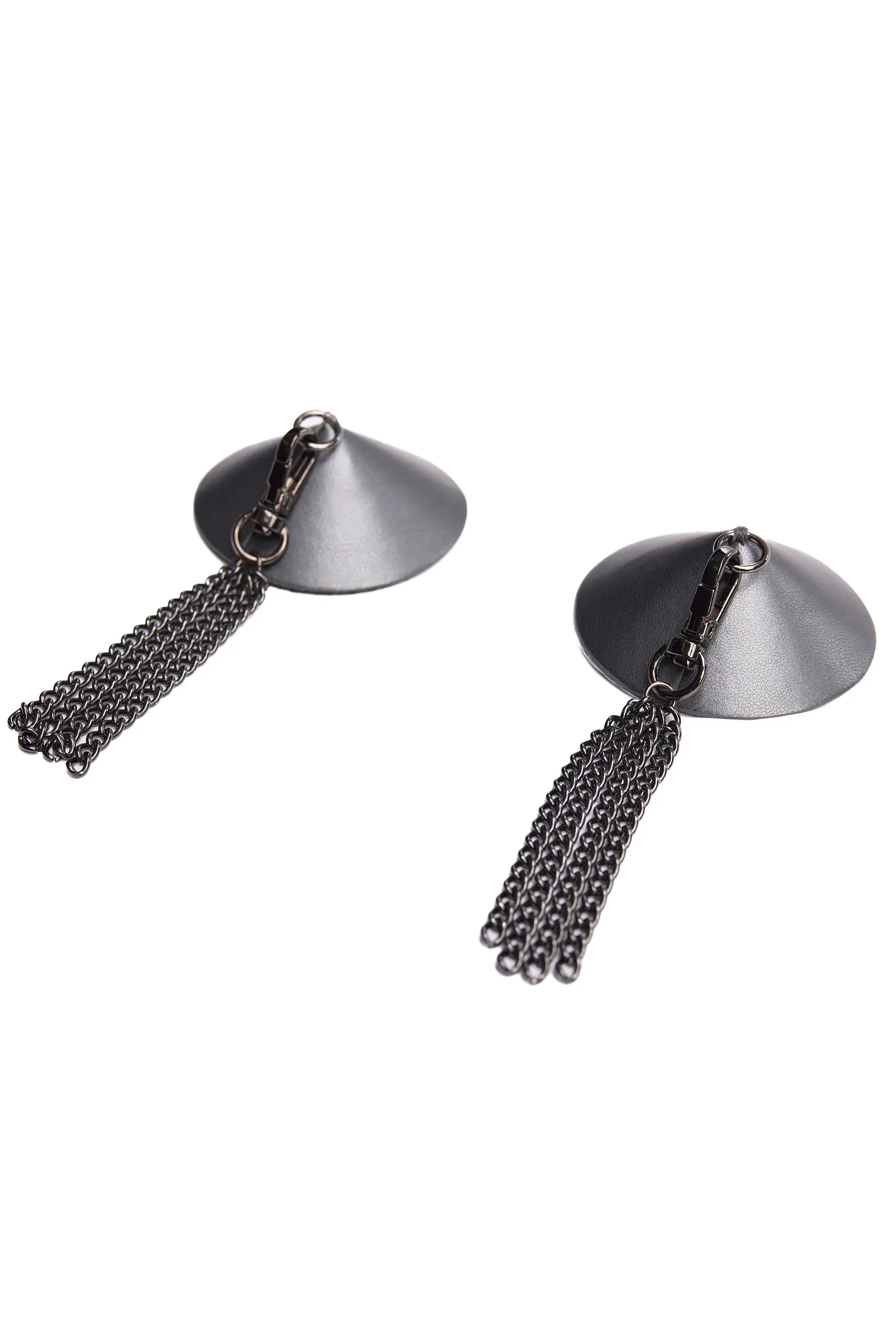 Embody a glamorous, bold, and daring look with our Gunmetal Glam Pasties featuring removable chain tassels for a versatile style. The 3" metal chain length adds edge to the round shaped design, while the reusable self-adhesive backing ensures a secure fit. With a diameter of 2".