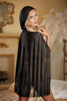 Unleash your inner seductress with the Serena cape! With its unique design and flattering waist belt, this cape is perfect for daring nights out. You can wear it with or without other pieces depending on your mood, making it the perfect addition to your wardrobe. The lace detailing adds an extra touch of allure while the hood brings a dramatic flair. Get ready to make a statement with this cape - are you ready to show and tease?! (Please note: *G-string not included.)