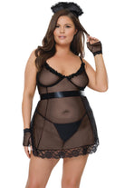 The Parisian Pleasures Maid Set is a captivating ensemble that balances romance and sophistication, featuring supportive cups and a sultry back keyhole. It also includes a removable ribbon tie belt, playful bow details, delicate lace trim, matching fingerless gloves, an adjustable satin headpiece, and adjustable straps for a comfortable and alluring fit. Made from sheer stretch nylon, this set is effortlessly seductive.