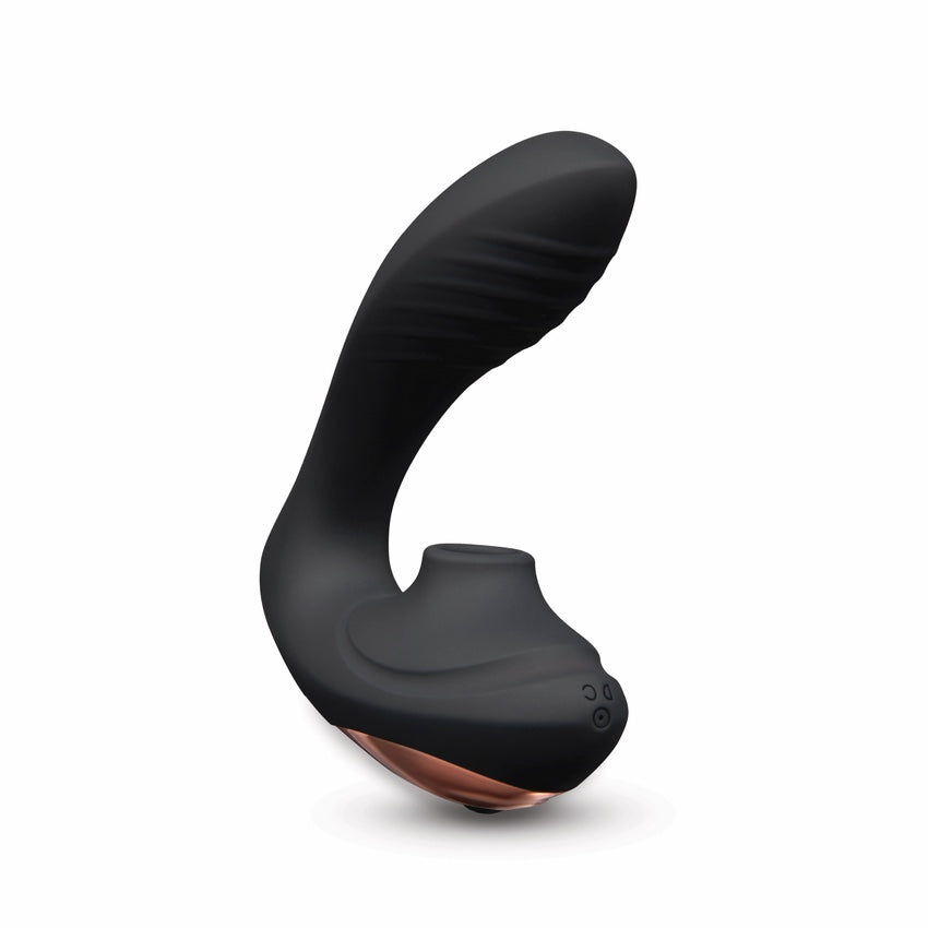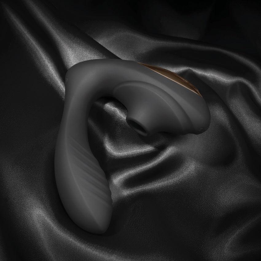 Unleashing powerful dual stimulation. Reach new heights of orgasmic pleasure with this luxurious dual stimulating vibe. Featuring 10 internal vibration patterns, as well as 10 levels of clitoral pleasing intensity, this toy will have you feeling like royalty. Bursts of gentle air mimic clit sucking sensations while the flexible internal arm offers a sense of desirable fullness and deep-pleasing vibrations.