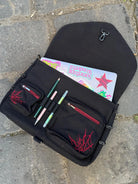Hanging Side Chains & Additional Spiderweb Embroidered Zip Pockets and Elastic Pen Holders Under the Flap